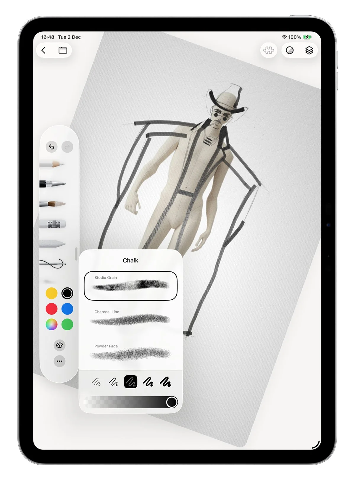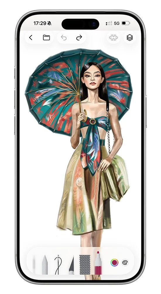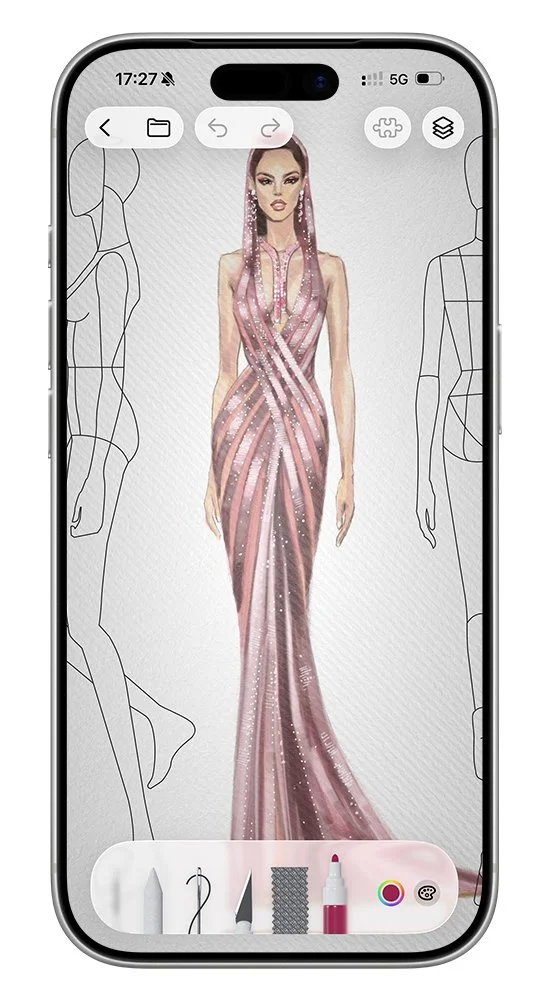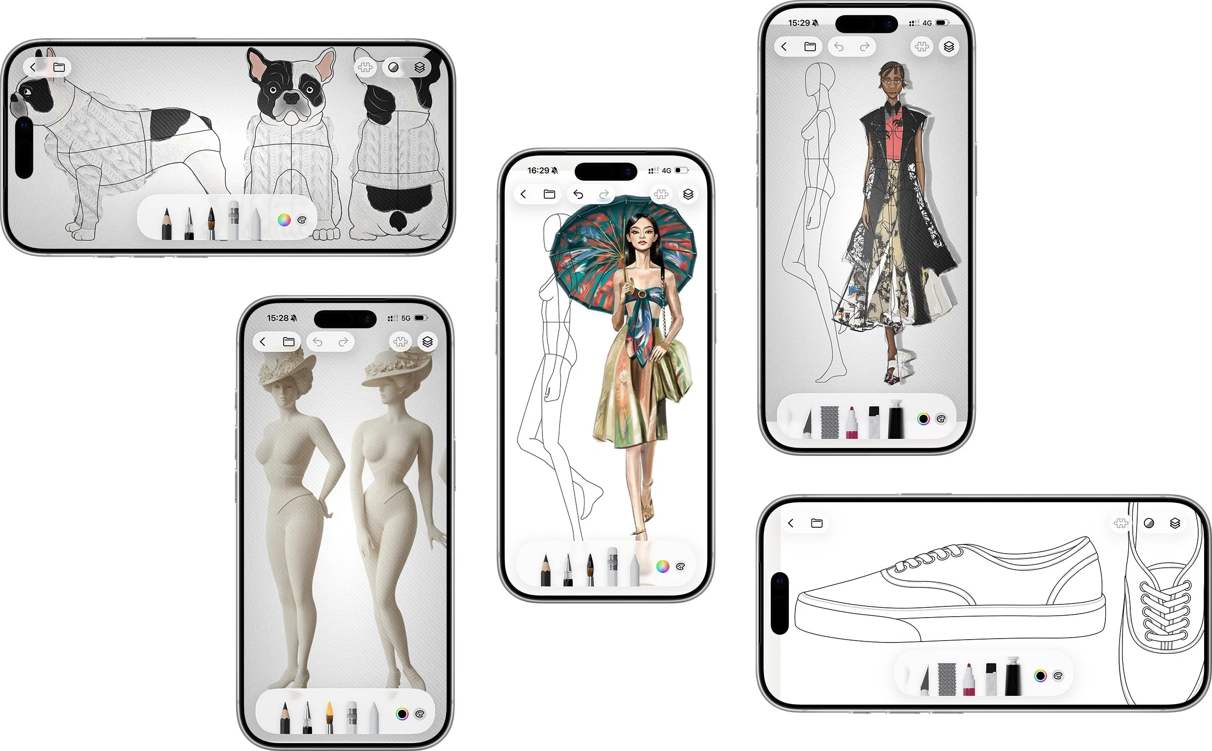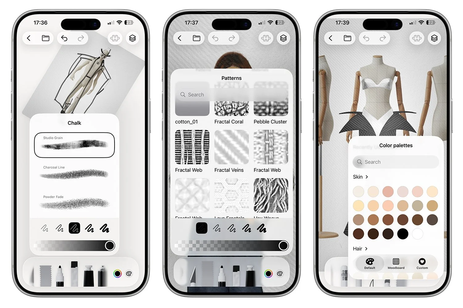 Of textures...3D paper surfaces, lighting-reactive materials, and brushes that behave like real tools on real substrates. The same patented technology that made Prêt-à-Makeup the iPad App of the Year in 2023 now elevates the world of fashion drawing — making digital illustration feel physical, tactile, and emotionally resonant.