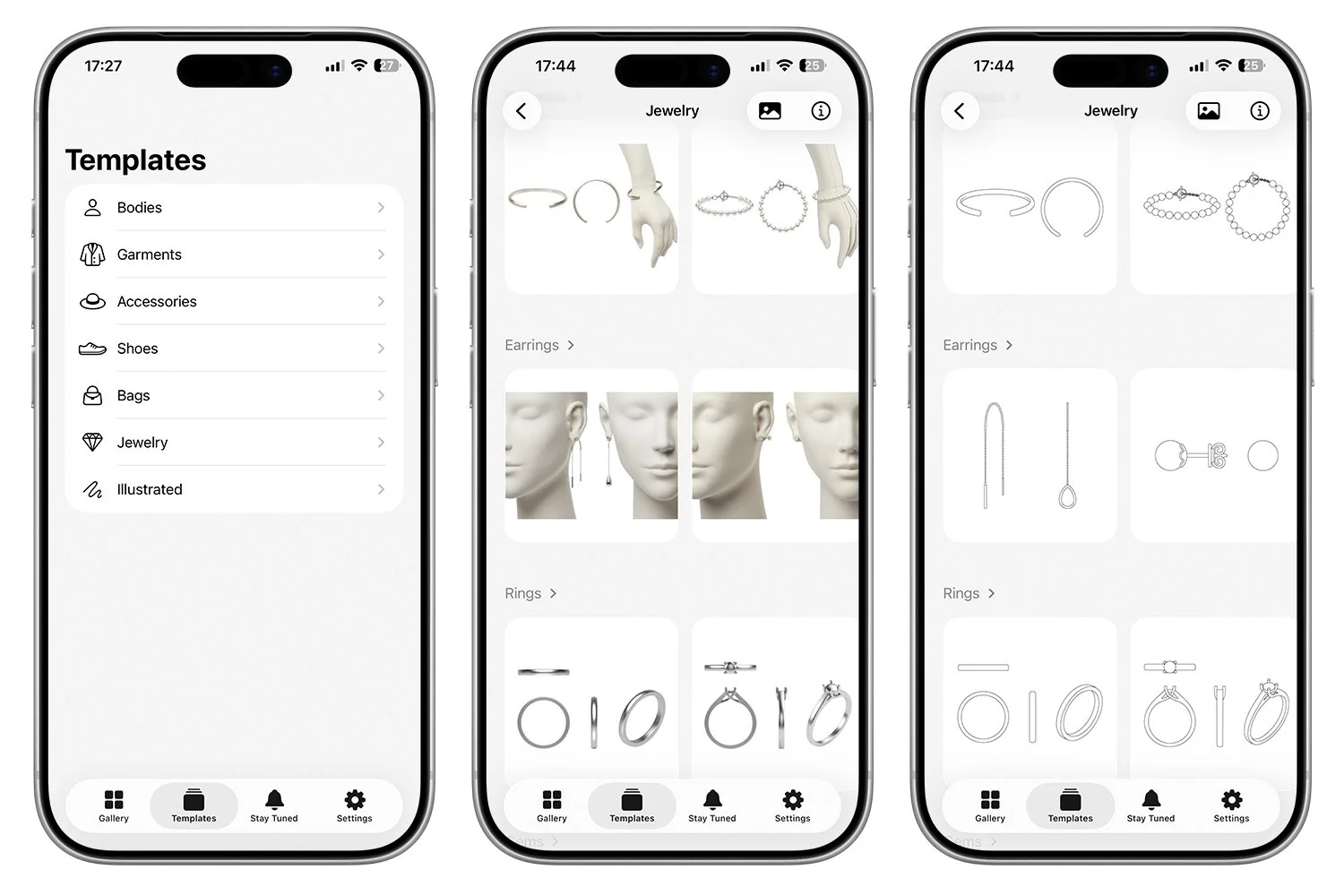For the first time, you can choose how to start your creative journey. Alongside our iconic three-view guidelines — side, front, and back — we now offer realistic off-white product renderings with true depth, volume, and material presence. Whether you prefer drawing over technical linework or building directly onto a lifelike base, Prêt-à-Template adapts to your process, giving you complete creative freedom.